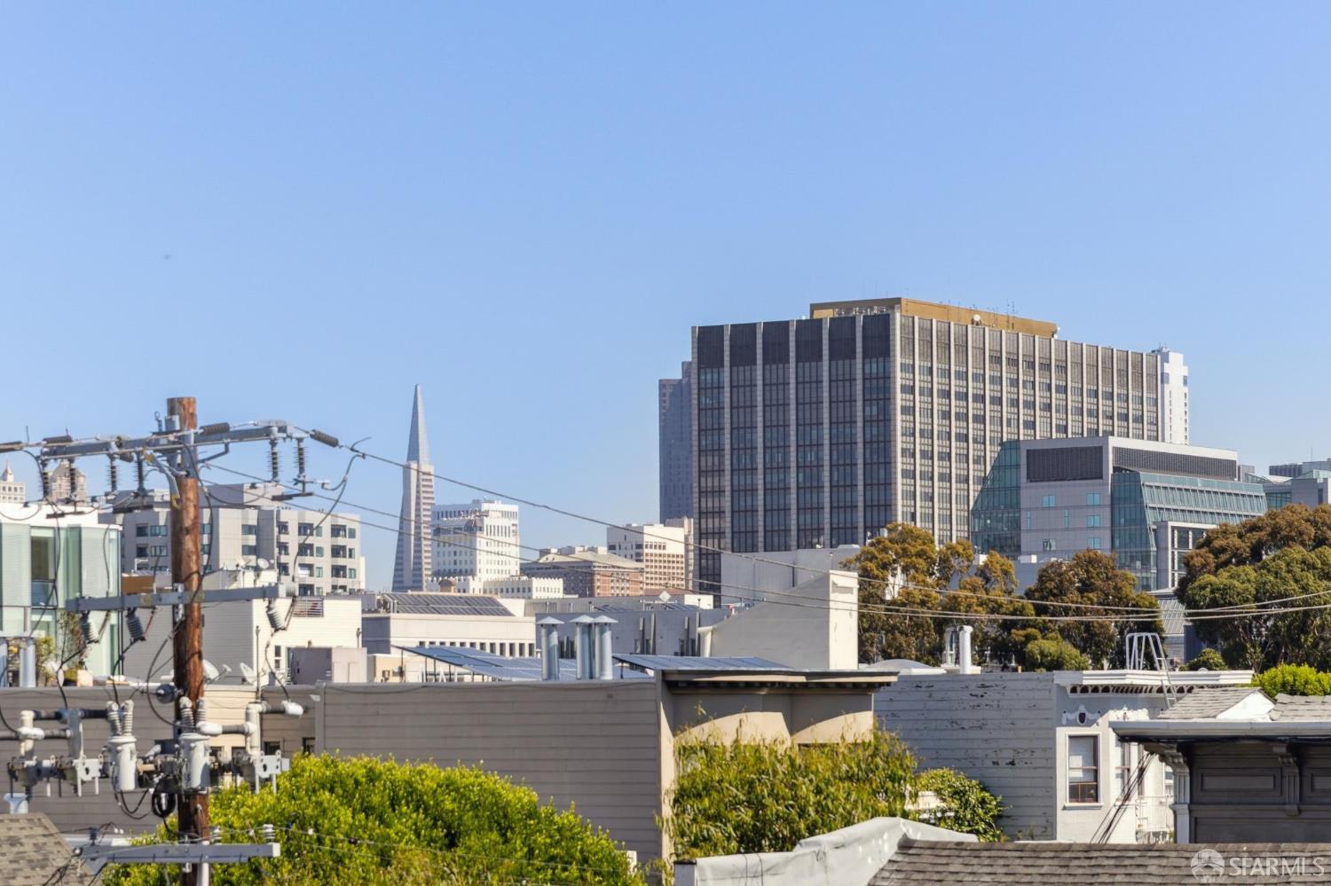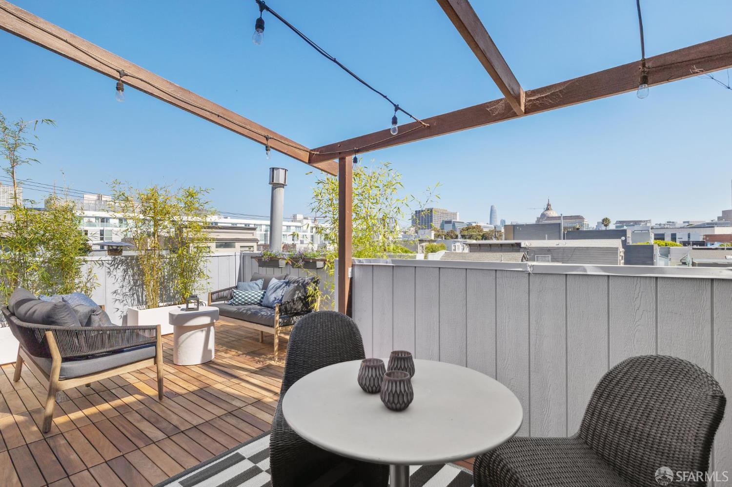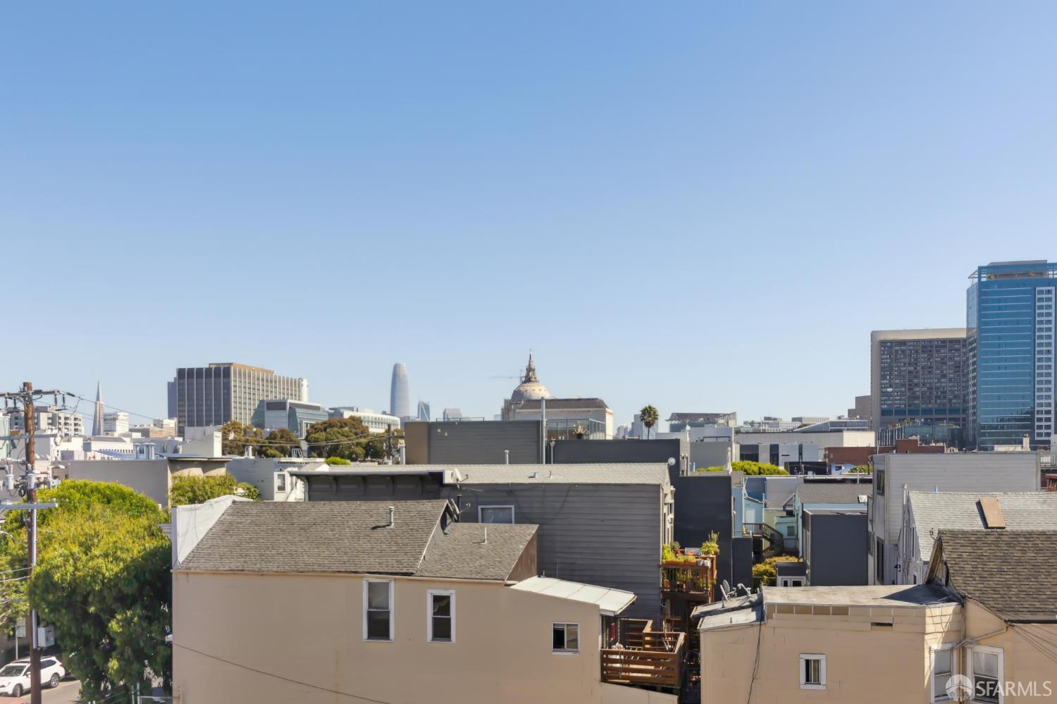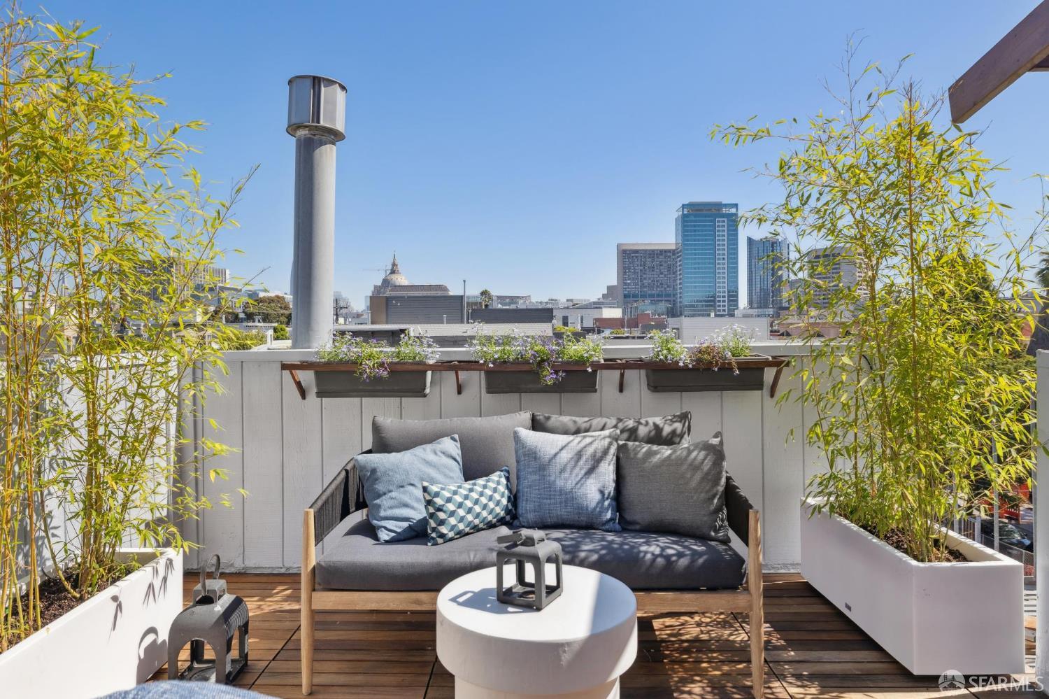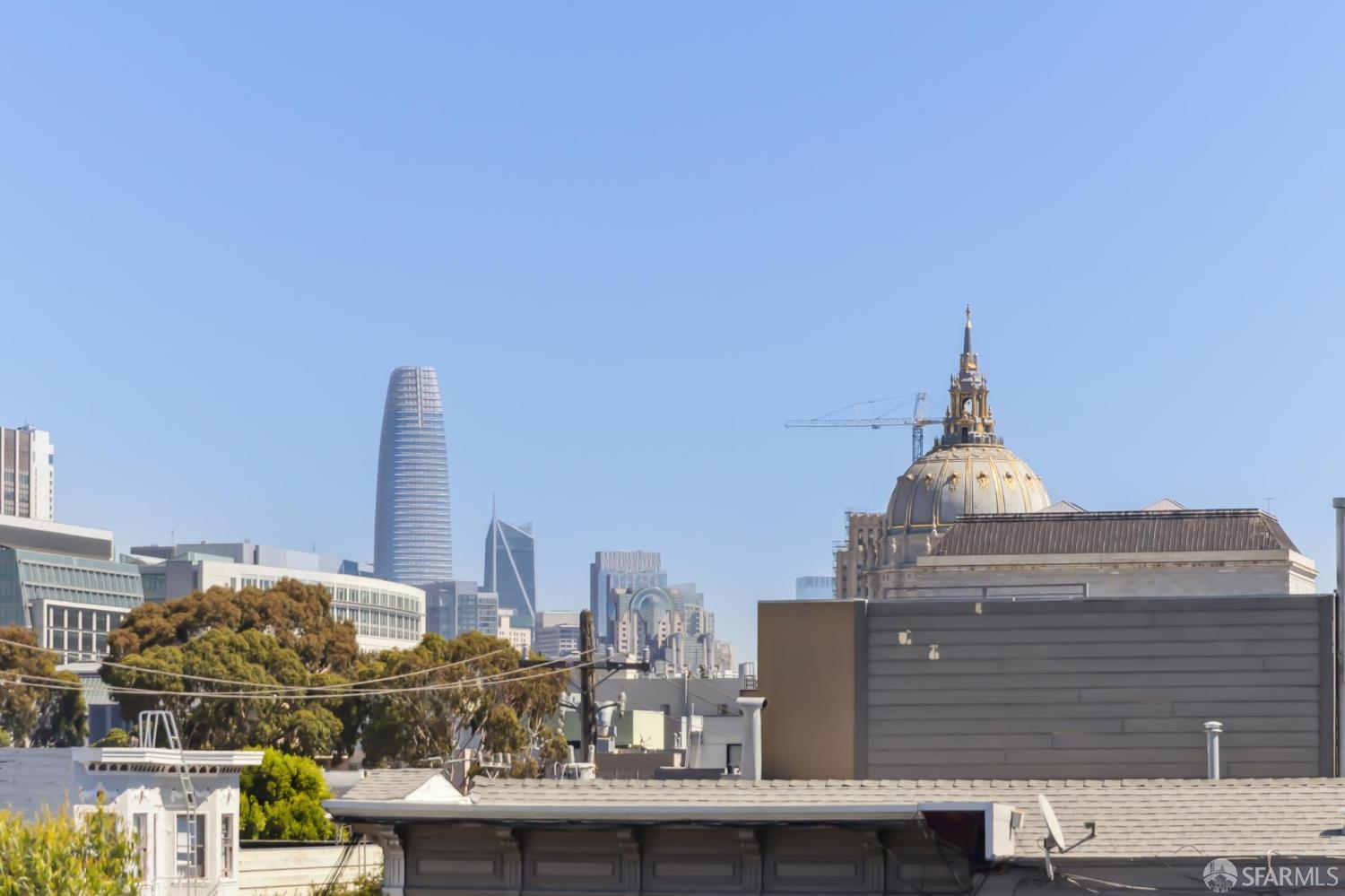 This beautifully remodeled top floor flat is nestled in a boutique three-unit building. Located just one block from the renowned Hayes Valley shops, restaurants and the new Trader Joes, this home places you at the heart of one of San Francisco's most desirable neighborhoods. This urban retreat has a spacious deck with Bison IPE tiles that receives abundant sunlight and offers captivating views of the surrounding neighborhood, including the iconic gold-accented roof of City Hall. The open-concept floorplan highlights beautiful wood flooring, built-in speakers and new lighting fixtures creating a welcoming atmosphere ideal for hosting guests. The remodeled kitchen features a large island, sleek quartz counters, wine fridge and a striking glass tile backsplash. The inviting living room offers a wood burning fireplace for cozy evenings while the dining room has lovely city views. Both bathrooms have been remodeled with quartz counters and Fire Clay Tile. Lighting throughout the residence has been exclusively upgraded with fixtures from Herman Miller, Rejuvenation and Schoolhouse Electric. The Building improvements consist of a newer roof, windows, exterior paint and siding. Laundry, storage,& deck irrigation included.