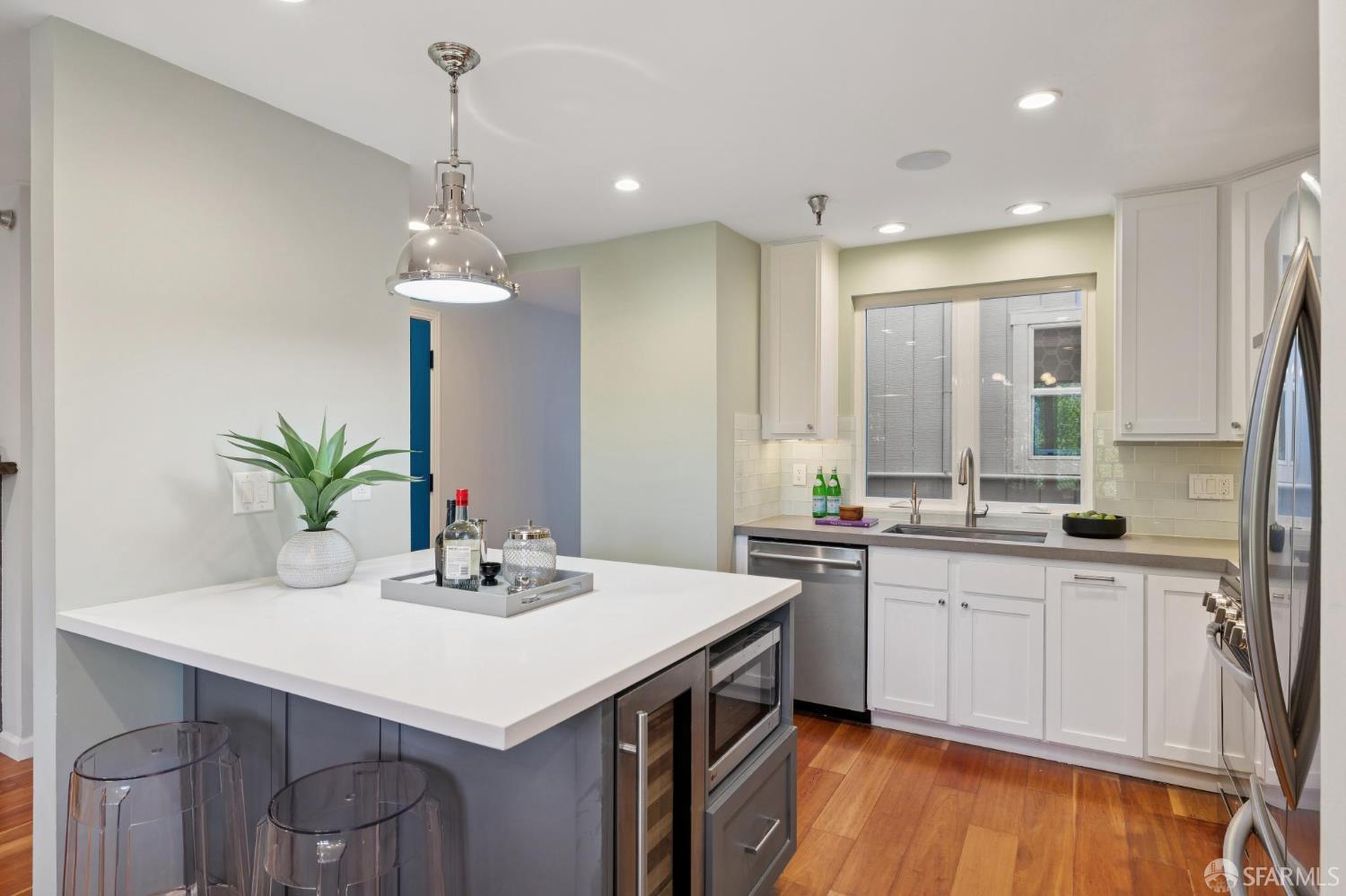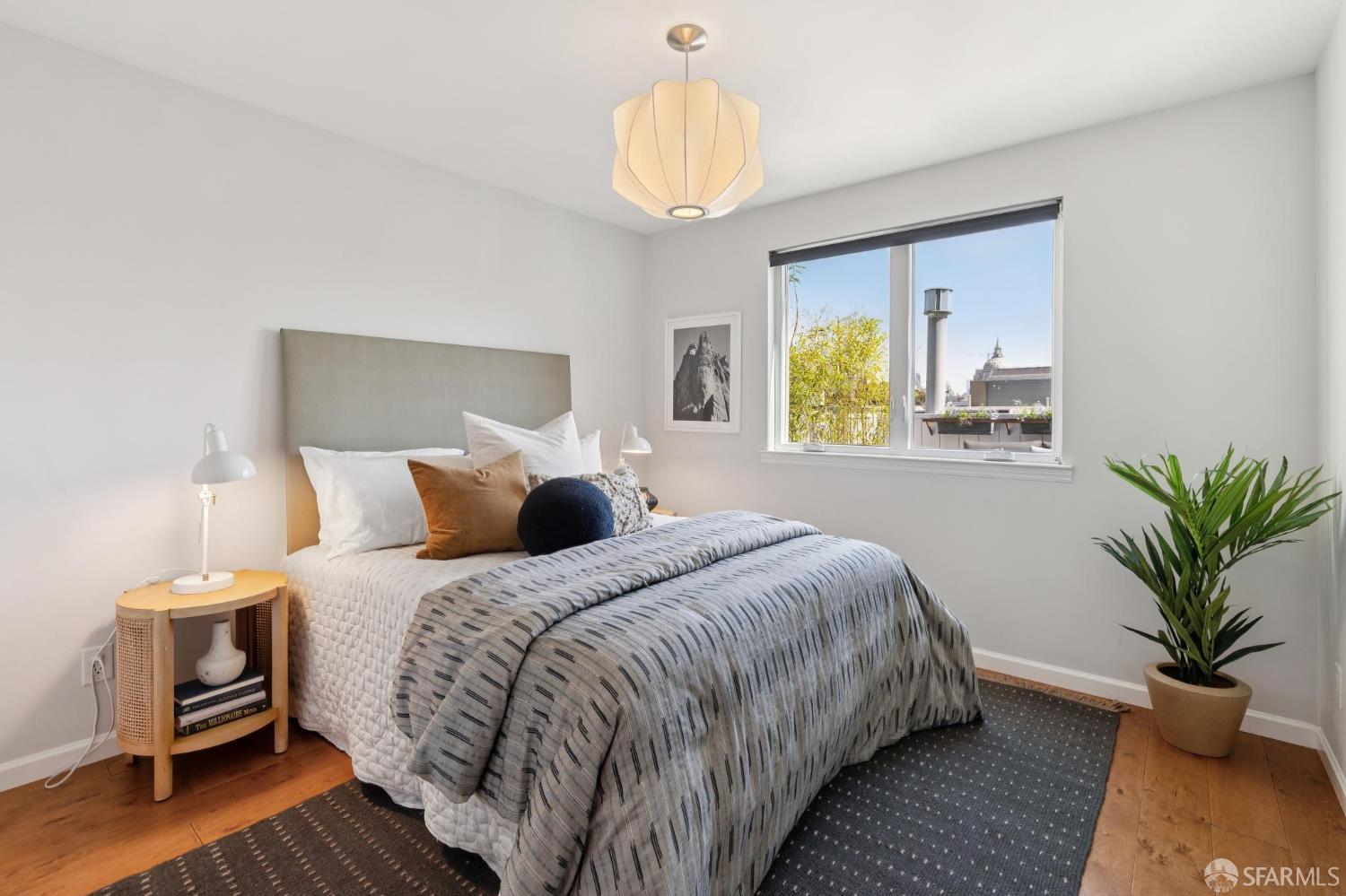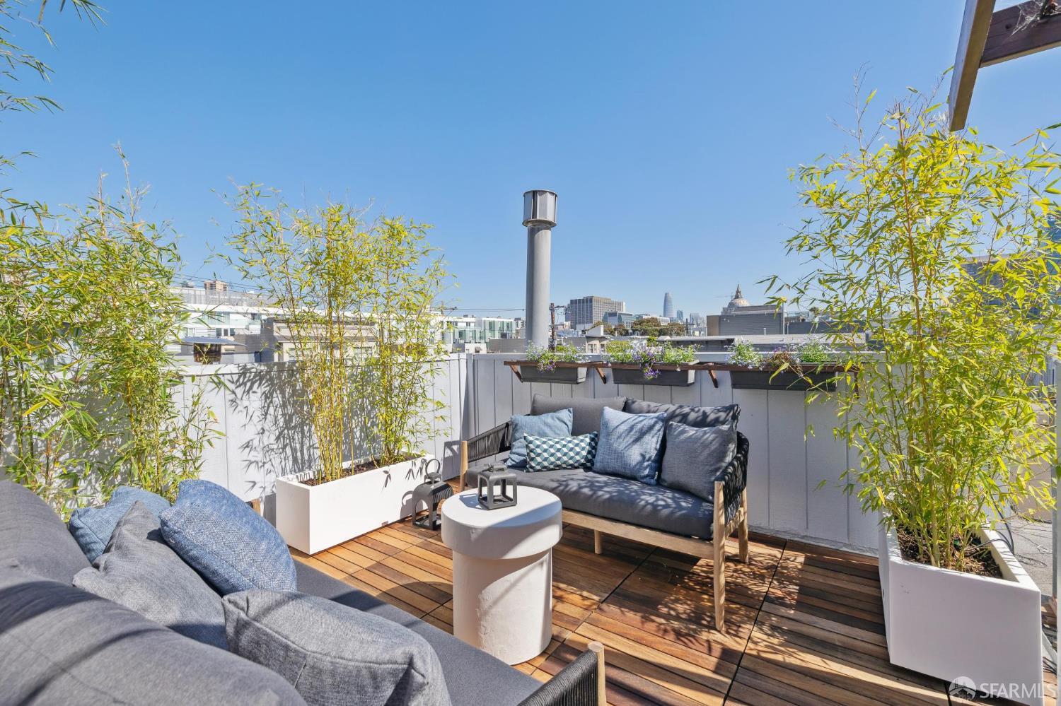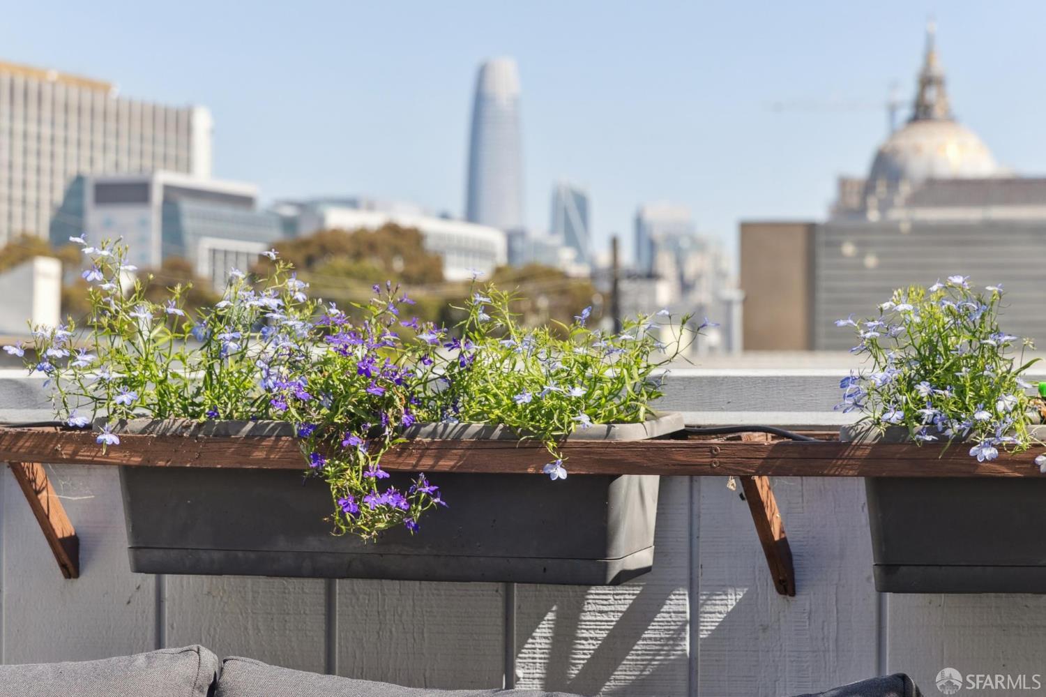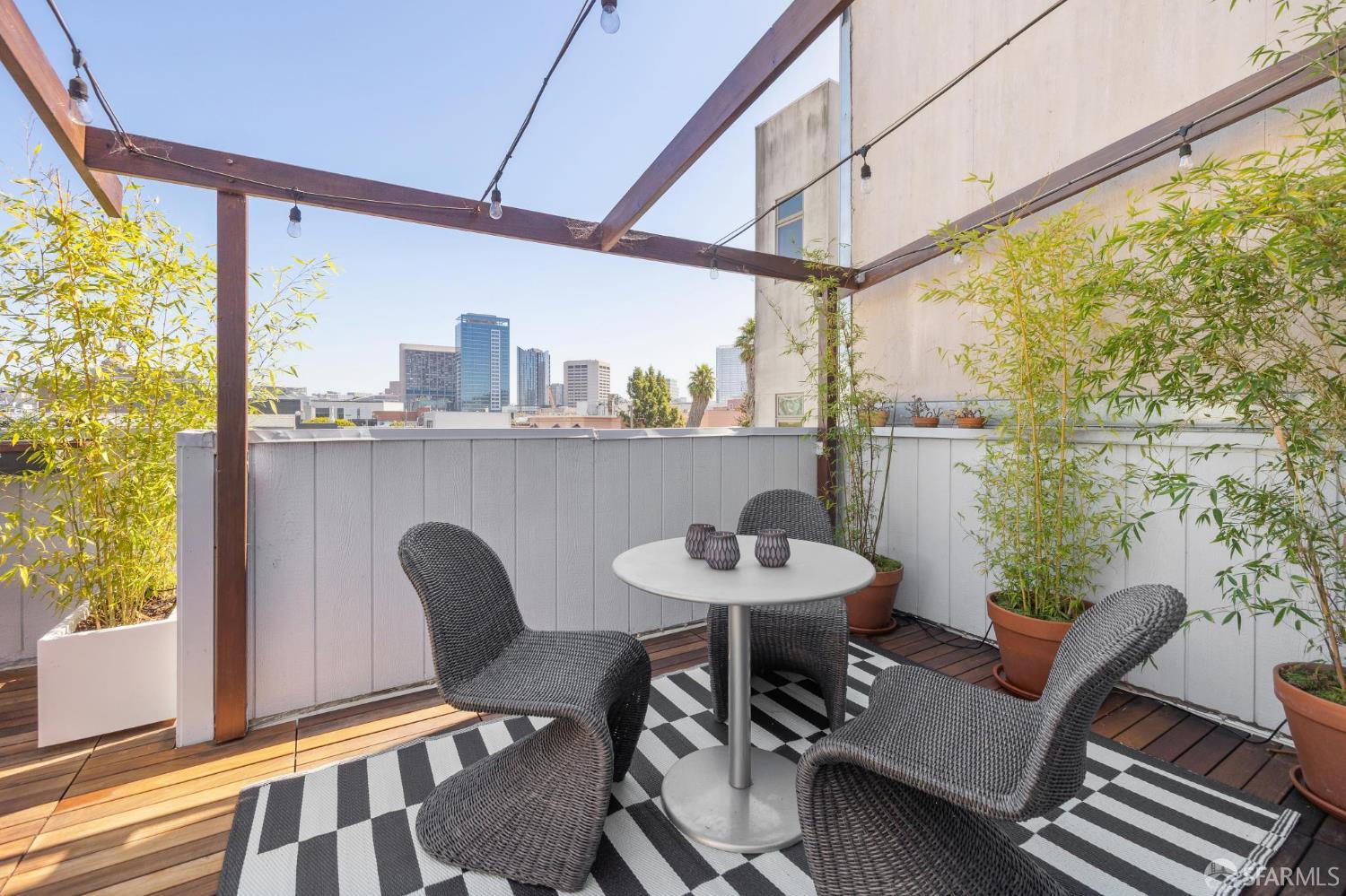 This beautifully remodeled top floor flat is nestled in a boutique three-unit building. Located just one block from the renowned Hayes Valley shops, restaurants and the new Trader Joes, this home places you at the heart of one of San Francisco's most desirable neighborhoods. This urban retreat has a spacious deck with Bison IPE tiles that receives abundant sunlight and offers captivating views of the surrounding neighborhood, including the iconic gold-accented roof of City Hall. The open-concept floorplan highlights beautiful wood flooring, built-in speakers and new lighting fixtures creating a welcoming atmosphere ideal for hosting guests. The remodeled kitchen features a large island, sleek quartz counters, wine fridge and a striking glass tile backsplash. The inviting living room offers a wood burning fireplace for cozy evenings while the dining room has lovely city views. Both bathrooms have been remodeled with quartz counters and Fire Clay Tile. Lighting throughout the residence has been exclusively upgraded with fixtures from Herman Miller, Rejuvenation and Schoolhouse Electric. The Building improvements consist of a newer roof, windows, exterior paint and siding. Laundry, storage,& deck irrigation included.