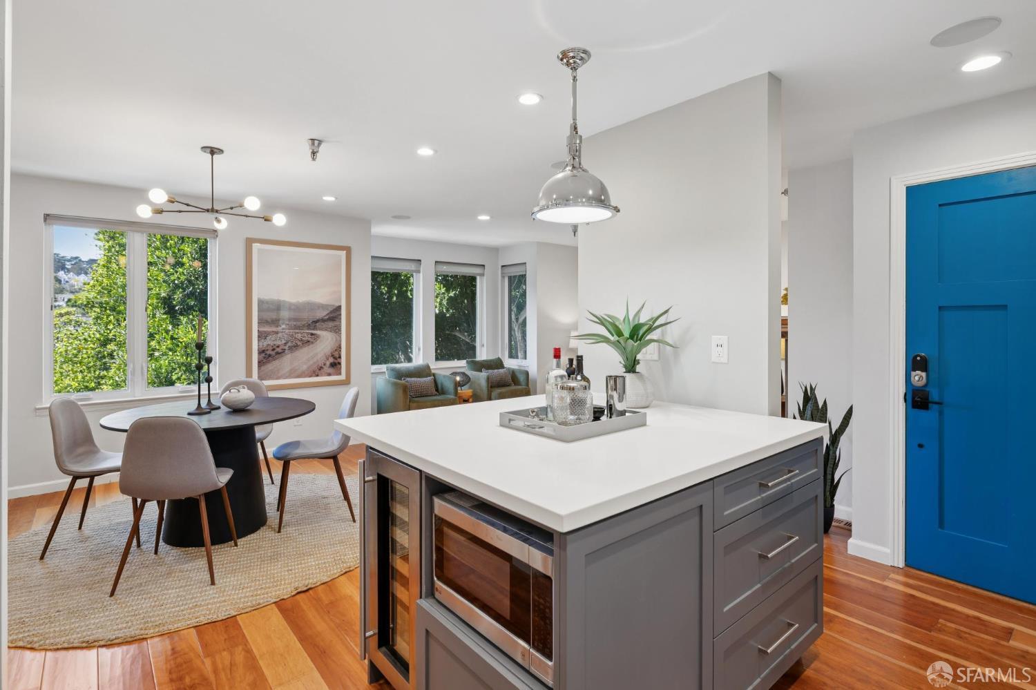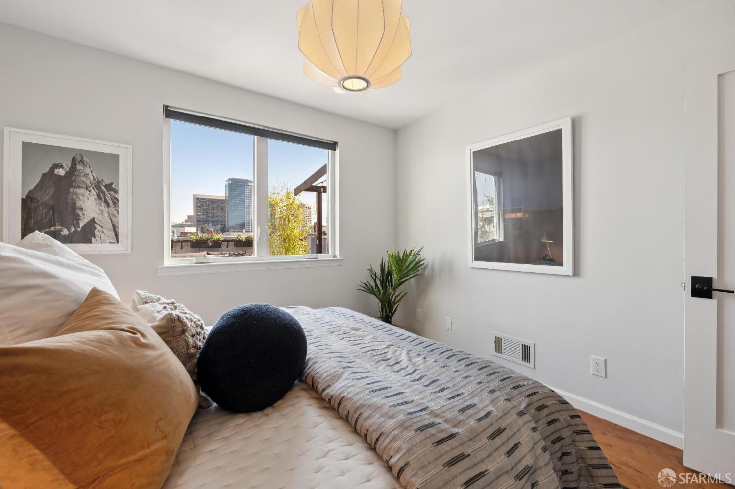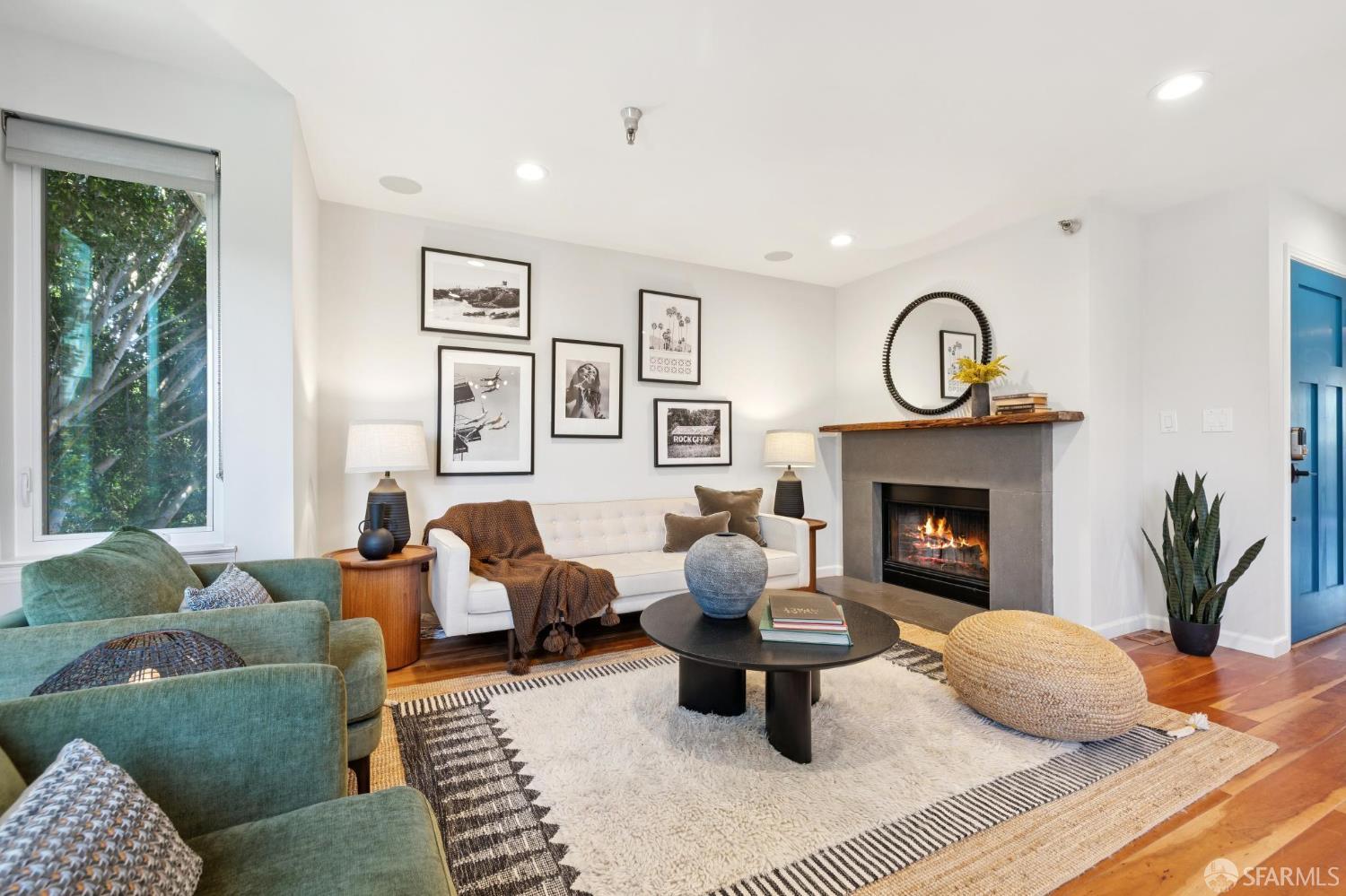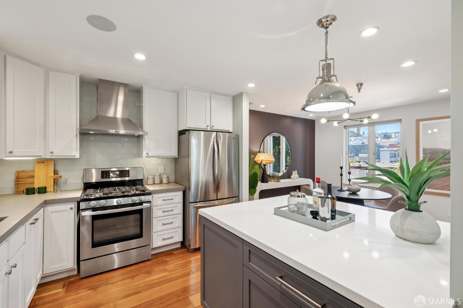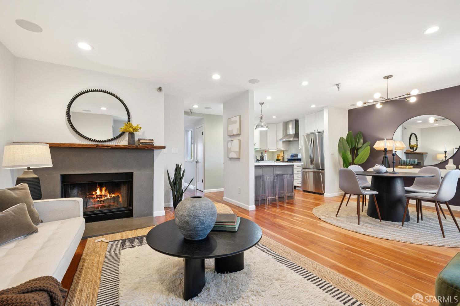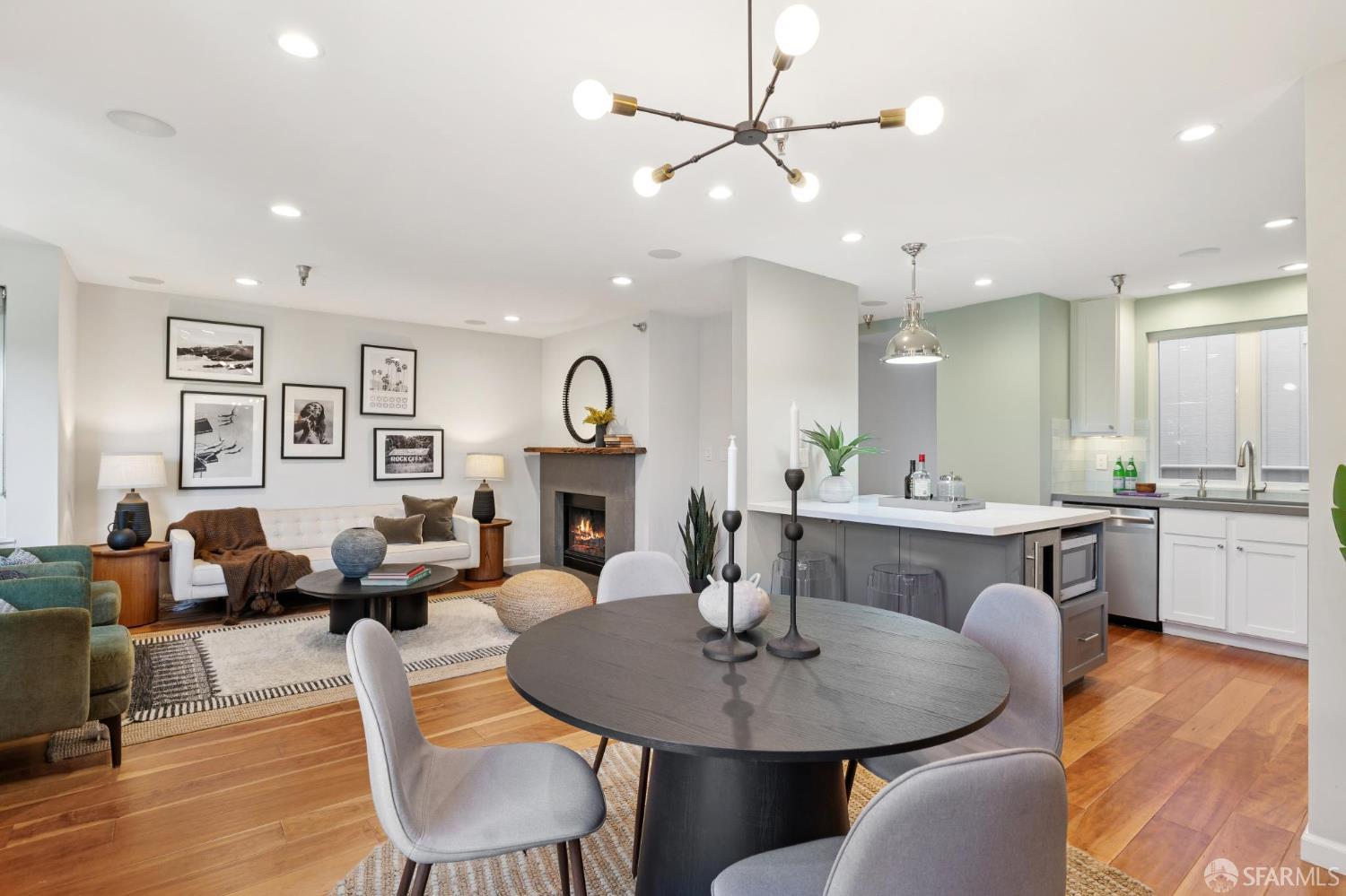 This beautifully remodeled top floor flat is nestled in a boutique three-unit building. Located just one block from the renowned Hayes Valley shops, restaurants and the new Trader Joes, this home places you at the heart of one of San Francisco's most desirable neighborhoods. This urban retreat has a spacious deck with Bison IPE tiles that receives abundant sunlight and offers captivating views of the surrounding neighborhood, including the iconic gold-accented roof of City Hall. The open-concept floorplan highlights beautiful wood flooring, built-in speakers and new lighting fixtures creating a welcoming atmosphere ideal for hosting guests. The remodeled kitchen features a large island, sleek quartz counters, wine fridge and a striking glass tile backsplash. The inviting living room offers a wood burning fireplace for cozy evenings while the dining room has lovely city views. Both bathrooms have been remodeled with quartz counters and Fire Clay Tile. Lighting throughout the residence has been exclusively upgraded with fixtures from Herman Miller, Rejuvenation and Schoolhouse Electric. The Building improvements consist of a newer roof, windows, exterior paint and siding. Laundry, storage,& deck irrigation included.