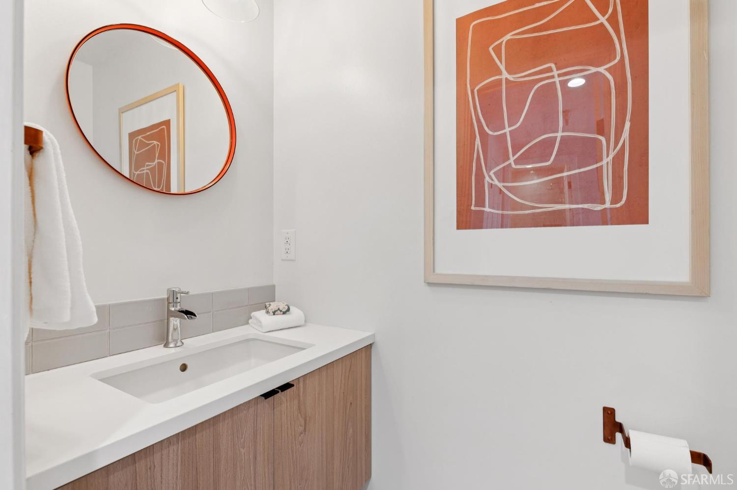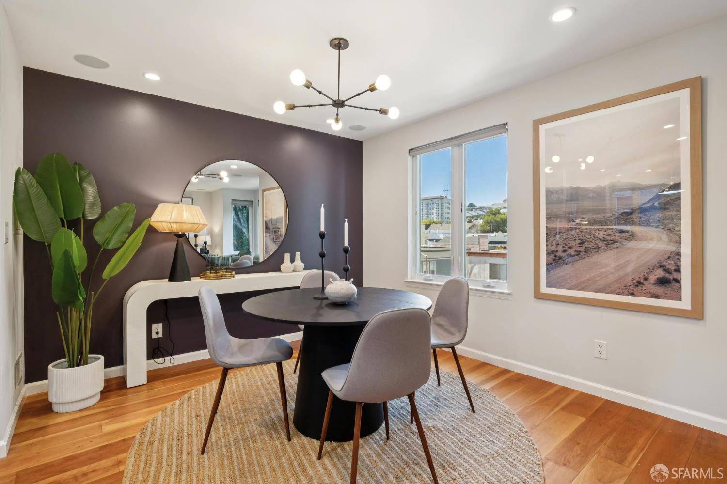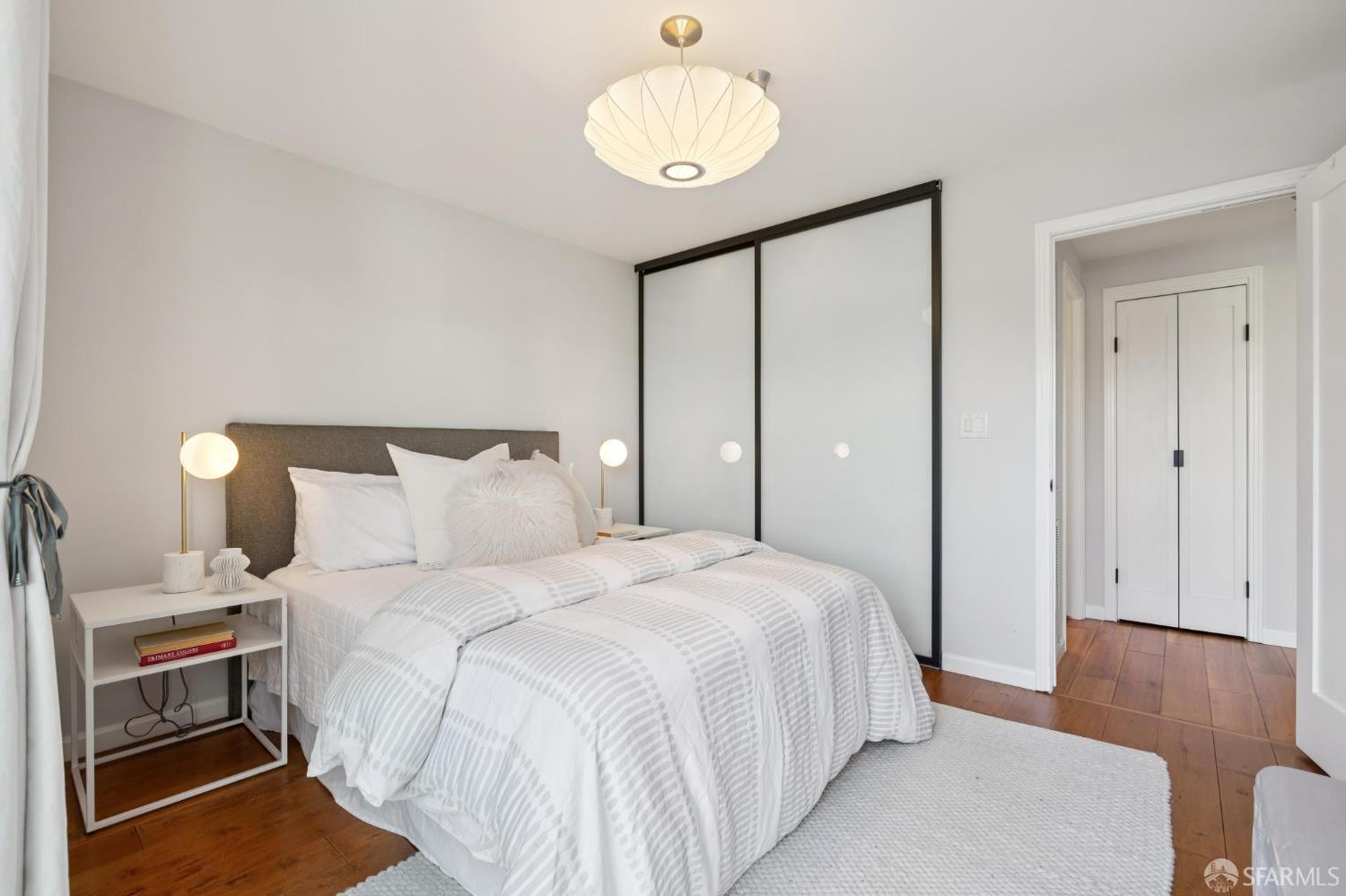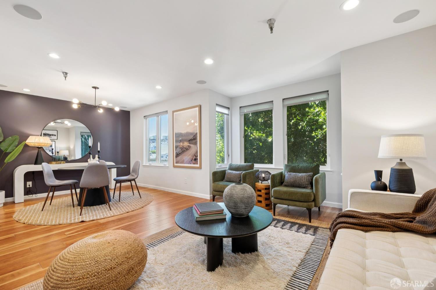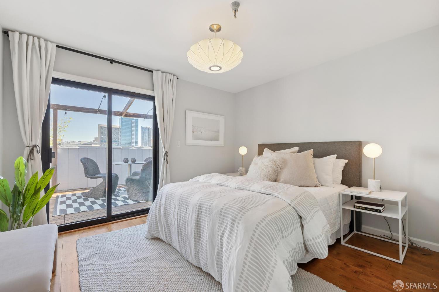 This beautifully remodeled top floor flat is nestled in a boutique three-unit building. Located just one block from the renowned Hayes Valley shops, restaurants and the new Trader Joes, this home places you at the heart of one of San Francisco's most desirable neighborhoods. This urban retreat has a spacious deck with Bison IPE tiles that receives abundant sunlight and offers captivating views of the surrounding neighborhood, including the iconic gold-accented roof of City Hall. The open-concept floorplan highlights beautiful wood flooring, built-in speakers and new lighting fixtures creating a welcoming atmosphere ideal for hosting guests. The remodeled kitchen features a large island, sleek quartz counters, wine fridge and a striking glass tile backsplash. The inviting living room offers a wood burning fireplace for cozy evenings while the dining room has lovely city views. Both bathrooms have been remodeled with quartz counters and Fire Clay Tile. Lighting throughout the residence has been exclusively upgraded with fixtures from Herman Miller, Rejuvenation and Schoolhouse Electric. The Building improvements consist of a newer roof, windows, exterior paint and siding. Laundry, storage,& deck irrigation included.